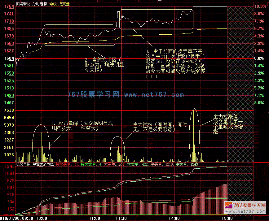1、早盘出现明显攻击量峰。(攻击量峰是指成交量比当日其它交易时段放大好几倍甚至十倍,这才是有效攻击量峰,形态呈现山字堆量,比平时多一两倍只能叫量峰不能叫攻击量峰。选股时有几只都在攻击量峰的情况下就选当天最大攻击量峰那只)
