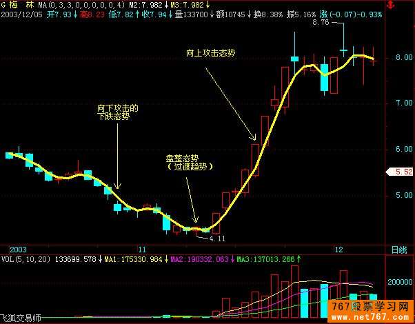 一种是3天均线向下的时候,被称为短期下跌态势。(角度越大,攻击力度越强,45度角是强弱界线)