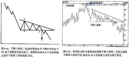 (我的感悟:下降三角形实际上就是上升三角形的相反形态,其下边线才是平行线,上边线则是向下与其会聚,其是看跌形态,无论在哪个大趋势里,其都具有看跌的意义,只不过要真正研判好这下降三角形或者上升三角形关键就在于这平行线,看是否真正平行,这很重要,如果不平行,其就将演变为其它形态,从而又带来不一样的研判断意义,呵呵,这就是技术分析的奥妙之处的体现了,有时候就是会呈现一种“仁者见仁,智者见智”的状况,什么叫艺术,这就叫艺术,形态分析越往里走,艺术感的味道就会变得越浓厚!)