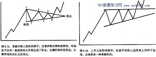 虽然三角形最低要求四个转折点,但许多三角形有图6.1a所示的六个转折点。这意味着,在恢复上升趋势前,在三角形内实际上有合起来形成五个浪的三个波峰和三个波谷。