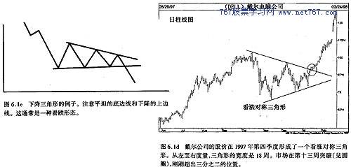 对称三角形(或称绕线筒)通常是一种持续形态。它代表现存趋势的停顿,此后原有的趋势会继续发展。在图6.1a的例子中,先前的趋势向上,因此三角形巩固形态之后市场向上的可能性大。如果趋势已经向下,那么对称三角形就有看跌的含意。