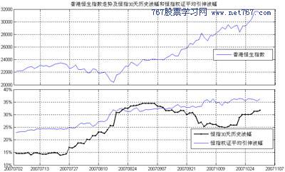 图中显示,港股由8月中旬之前的急跌3000多点转为不到3个月之内就急剧上升过万点,涨幅超过50%,而恒生指数的30天历史波幅从指数急挫前的不足15%快速上升,在9月初接近35%的高水平,但之后指数平稳上升,波幅反而有所回落,在10月下旬市况转为大幅震荡的时候,波幅却再度上升。