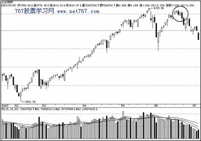 3. 空方已经开炮,趋势将会转变方向,在第二根阴线出现的时候,一定要注意及时退于场外。