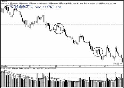 1. 指数在下跌途中出现了多次反弹阳线,同时也出现了多次阴吞阳的现象,不断上演的阴吞阳,使得下降趋势得以长时间延续;