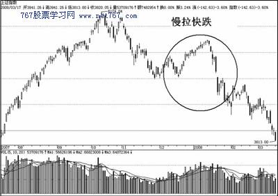 主流资金在出货的过程中,会使指数的K线形态出现各种各样的变化,但这些K线形态更多的是为了诱惑投资者而人为刻画的,其中有一种最明显的波动形态就是:慢拉快跌出货法。通过小幅度缓慢而连续的上拉,使投资者误认为一轮新的上涨行情将会展开,场中积累了足够的买盘以后,庄家便会在后期大规模地进行出货操作,从而形成快速下跌的走势。慢慢的上拉为养的过程,而快速的下跌为杀的过程,形态一旦完成,主流资金便可以功成身退。