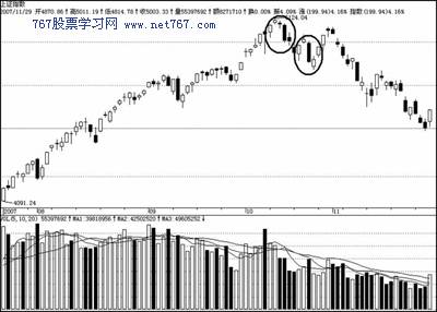 2. 在高位区间,指数在很短的时间内连续两次收出实体较大的阴线,并且阴线对后期的反弹起到了抑制作用,正是这两根大阴线促使了指数顶部的形成;