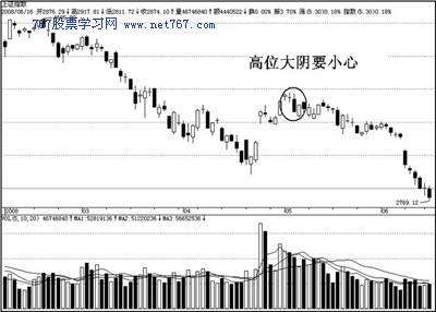2. 上涨到高点以后,指数出现了一根实体较大的阴线,这一天跌幅是上涨以来最大的跌幅,并且成交量出现放大现象,因此,可以把这一根阴线称作为:高位放大阴线,它是风险到来的标准信号之一;