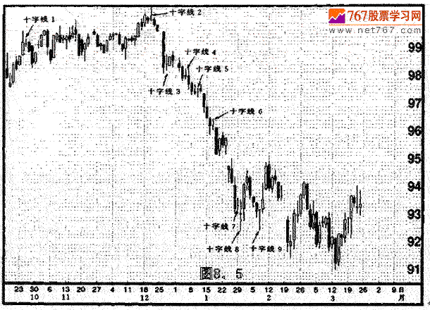 另一方面,虽然十字线在引发市场的顶部反转方面是相当有效的,但是根据我们的经验来看,在下降趋势中,十字线往往丧失了发挥反转作用的潜力。其中的原因可能是这样的:十宇线反映了买方与卖方在力量对比上处于相对平衡状态。由于市场参与者抱着骑墙的态度,市场往往因为自身的重力而下坠。因此,当十字线出现时,在上升趋势中,市场可能向下反转,而在下降趋势中,市场则可能继续下跌。因为上述原因,十字线在构成底部反转信号时,比作为顶部反转信号需要更多的佐证。如图8.5所示的实例很好地检验了这一原则。