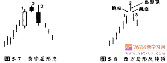 图5.7乍一看去,像是西方技术分析理论中的岛形反转形态。但仔细分析一下就会发现,这个黄昏星形态所提供的反转信号,岛形反转形态是提供不来的(参见图 5.8)。在岛形反转顶部形态中,交易时段2的最低点必须同时居于交易时段1和交易时段3的最高点之上。然而,在黄昏星形态中,仅仅要求实体2的低点高于实体1的高点,就可以构成叵转信号了。