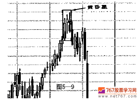如图 5.9所示的黄昏星形态,出现在 1987年夏的道.琼斯指数市场上,该形态标志着道.琼斯指数在当年那场暴跌之前的最高点(我很想知道,采用蜡烛图的日本技术分析师当时是否看出了这个图形!)。