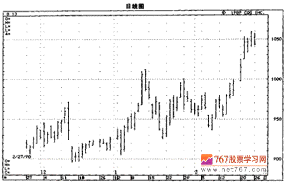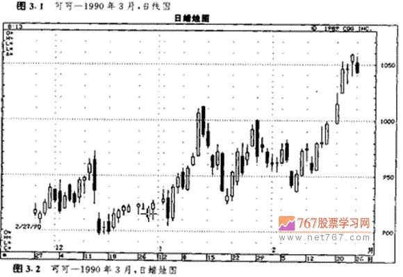 将线图与蜡烛线日放到一起直观地比较一下,其差别一目了然。图3.1是西方式线图。图3.2是用图3.1同样的价格内容绘成的蜡烛图。在这张蜡烛图上,价格的起伏变地跃然纸上,给人一种"立体市场"的视觉感受。比较而言,蜡烛图把平面的二线线图提升为三维图像了。从这个方面来看,蜡烛图的视觉效果更令人振奋。