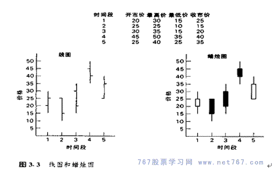 在图3.3中,首先列出了一组数据,然后根据这组数据,分别作出了相应的线图和蜡烛图。虽然图示的日线图和日蜡烛图采用的是同一组数据,但我们很容易就能看出,它们在作法上大异其趣。在蜡烛图的图线内部,有一段胖鼓鼓的部分,称为实体。它表示了相应交易日的开市价与收市价之间的价格范围。如果实体是黑色的(即,将之涂满黑色)测代表当日的收市价低于开市价。如果实体是白色(红色)的(即.将它保留为空白),则表示当日收市价高于开市价。