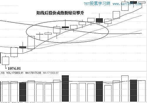 在多头行情发展中,股价或指数推高后,出现缩量上涨,是筹码稳定的一种表现,股民持股待涨,但是也说明市场参与较为谨慎,追高意愿不足,多出现在行情发展的中级阶段或市场经过一轮调整后。在下跌反弹中出现这种情况,是一种缺少人气的表现,一般不会反弹太高,而是重新走向下跌。