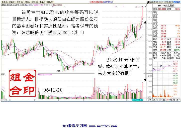过去的就不多说,今日600770综艺股份走势股价又到了关键时刻。是很需要作必要的跟踪分析。首先综艺股份大主力再度入场是从8月中开始,一直到上周五,笔者仍然认为主力在拉高时强势反反复复震荡中收集筹码。按照近三个月以来的筹码换手均价,这段时间主力收集的筹码成本在10.00元至10.50元之间。这是一个估计值,但偏差也不会很大。该股如此耐心的收集筹码可以说目标远大,目标远大的理由在综艺股份公司的基本面看好和实质性题材的存在。至于基本面的研究这就有劳于各位对该股票有兴趣的投资者细心研究了。以现时主力的此耐心收集筹码的态度和主力操盘手的老炼手法,笔者保守的预测:综艺股份明年股价见30元以上。 立眼于中长线,回望于近日走势! 看了综艺股份今日的涨停,其实还可以看看之前平台和昨天主力用心良苦的洗盘。