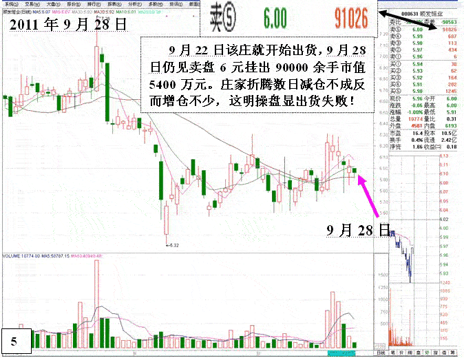 庄家做庄运作个股目的自然是为了资产增值产生利润。庄家运作个股操纵股价脱离不了,吸筹,洗盘,拉高,出货这些环节。每一个环节下都有不同的操作手法和表现。A股市场近年来出现一群以超短线操作为主的短线庄。这些庄家能做到今日下午进场,明天早盘开盘就拉高出货。也有部分短庄的运作时间稍微长点:“一日拿货,一日洗盘,一日拉高,拉高就出;进出整个过程在一周内完成”。这些短线庄家运作拿货是整个环节最最容易的一个环节,出货则成为所有做庄中最难最耗时的操作环节。部分资金规模不大的短庄只用一日就可完成拿货,但出货却要用上两三个交易日甚至更长的时间才能出完。做庄出货最难最耗时有两大核心原因: 一, 原建仓筹码较难在一两日轻松全部卖掉 二,庄家获得利润主要靠自己的拉抬!出货时拉高股价盘中还要护盘,这都要继续不断做买入动作。在一天出货中很难把原建仓筹码全部卖掉,出货时为了拉高和护盘买入的筹码当天无法卖出。在出货初期庄家为保证整体利润幅度,上一交易日买入的筹码在下一交易日拉高再出。下一交易日为了拉高和护盘的筹码在接着的下一交易日继续拉高再出。“反复的买入拉高,出货;买入拉高,出货滚动操作相当耗时”。上述是滚动操作法!一般在出货尾声筹码派发的差不多了,庄家往往不再拉高和护盘而是直接往下砸盘方式出货。个股在庄家出货尾声时跌的又多又狠!这些短庄除了运用“滚动操作法”操盘,部分庄家在一次性拉高股价后一路往下出货不再入市拉抬。采用这种出货手法必然会令整个运作的整体利润大幅减少。对于一次性拉升幅度特别大的个股,庄家就可以快速一路往下压价快速出货。同时一般在短庄介入不深的情况下常用到这种手法出货。对于一次性拉升幅度不大或者介入较深个股,庄家往往运用第一次拉高出前面的,今天拉高出昨天买的,明天拉高出今天买的这样滚动操作法操盘。因此有时有些投资者看盘时明明看到某股票明显出现机构大量出货痕迹,就是不明白为什么该股股价短线仍然在一阴一阳相隔中创出新高。下面以近日多个由短线庄家运作的个股为例介绍介绍庄家这一滚动操作法操作手法!