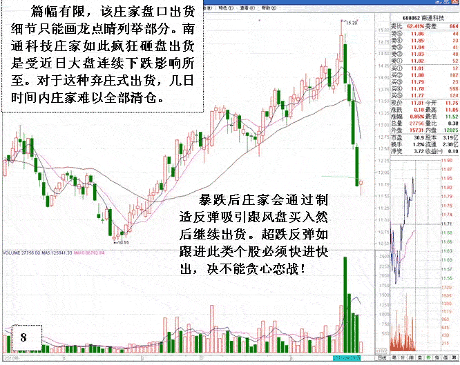 庄家做庄运作个股目的自然是为了资产增值产生利润。庄家运作个股操纵股价脱离不了,吸筹,洗盘,拉高,出货这些环节。每一个环节下都有不同的操作手法和表现。A股市场近年来出现一群以超短线操作为主的短线庄。这些庄家能做到今日下午进场,明天早盘开盘就拉高出货。也有部分短庄的运作时间稍微长点:“一日拿货,一日洗盘,一日拉高,拉高就出;进出整个过程在一周内完成”。这些短线庄家运作拿货是整个环节最最容易的一个环节,出货则成为所有做庄中最难最耗时的操作环节。部分资金规模不大的短庄只用一日就可完成拿货,但出货却要用上两三个交易日甚至更长的时间才能出完。做庄出货最难最耗时有两大核心原因: 一, 原建仓筹码较难在一两日轻松全部卖掉 二,庄家获得利润主要靠自己的拉抬!出货时拉高股价盘中还要护盘,这都要继续不断做买入动作。在一天出货中很难把原建仓筹码全部卖掉,出货时为了拉高和护盘买入的筹码当天无法卖出。在出货初期庄家为保证整体利润幅度,上一交易日买入的筹码在下一交易日拉高再出。下一交易日为了拉高和护盘的筹码在接着的下一交易日继续拉高再出。“反复的买入拉高,出货;买入拉高,出货滚动操作相当耗时”。上述是滚动操作法!一般在出货尾声筹码派发的差不多了,庄家往往不再拉高和护盘而是直接往下砸盘方式出货。个股在庄家出货尾声时跌的又多又狠!这些短庄除了运用“滚动操作法”操盘,部分庄家在一次性拉高股价后一路往下出货不再入市拉抬。采用这种出货手法必然会令整个运作的整体利润大幅减少。对于一次性拉升幅度特别大的个股,庄家就可以快速一路往下压价快速出货。同时一般在短庄介入不深的情况下常用到这种手法出货。对于一次性拉升幅度不大或者介入较深个股,庄家往往运用第一次拉高出前面的,今天拉高出昨天买的,明天拉高出今天买的这样滚动操作法操盘。因此有时有些投资者看盘时明明看到某股票明显出现机构大量出货痕迹,就是不明白为什么该股股价短线仍然在一阴一阳相隔中创出新高。下面以近日多个由短线庄家运作的个股为例介绍介绍庄家这一滚动操作法操作手法!