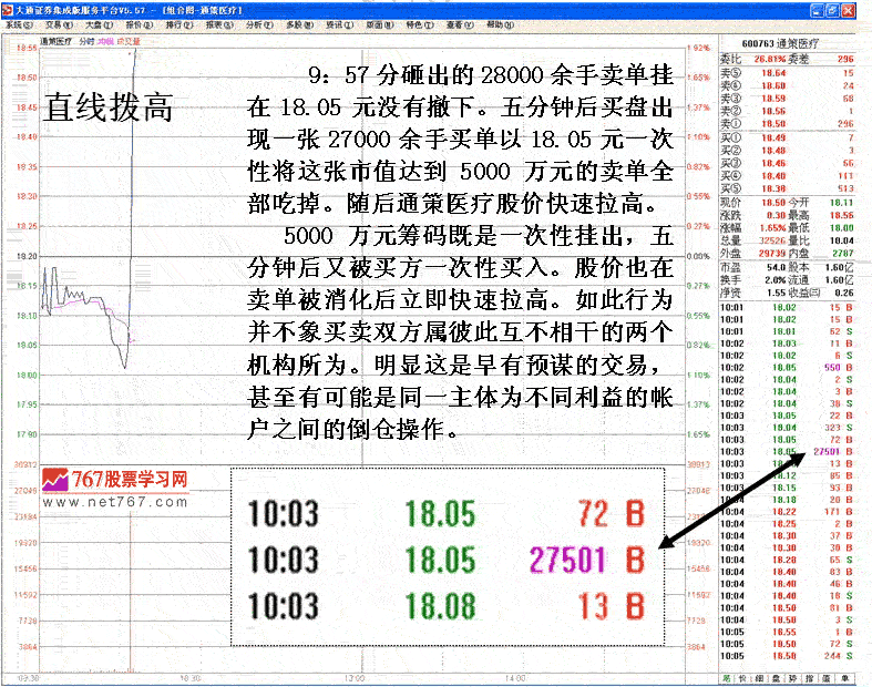 大部分庄家明显操纵的盘口交易细节,除当事者之外也无人知 晓 。 2011 年 2 月 24 日 通策医疗[600763]盘面出现的神秘一幕便是如此。