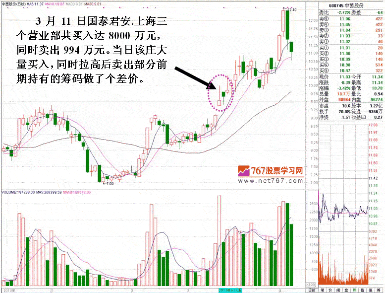 庄家做庄运作个股目的自然是为了资产增值产生利润。庄家运作个股操纵股价脱离不了,吸筹,洗盘,拉高,出货这些环节。每一个环节下都有不同的操作手法和表现。A股市场近年来出现一群以超短线操作为主的短线庄。这些庄家能做到今日下午进场,明天早盘开盘就拉高出货。也有部分短庄的运作时间稍微长点:“一日拿货,一日洗盘,一日拉高,拉高就出;进出整个过程在一周内完成”。这些短线庄家运作拿货是整个环节最最容易的一个环节,出货则成为所有做庄中最难最耗时的操作环节。部分资金规模不大的短庄只用一日就可完成拿货,但出货却要用上两三个交易日甚至更长的时间才能出完。做庄出货最难最耗时有两大核心原因: 一, 原建仓筹码较难在一两日轻松全部卖掉 二,庄家获得利润主要靠自己的拉抬!出货时拉高股价盘中还要护盘,这都要继续不断做买入动作。在一天出货中很难把原建仓筹码全部卖掉,出货时为了拉高和护盘买入的筹码当天无法卖出。在出货初期庄家为保证整体利润幅度,上一交易日买入的筹码在下一交易日拉高再出。下一交易日为了拉高和护盘的筹码在接着的下一交易日继续拉高再出。“反复的买入拉高,出货;买入拉高,出货滚动操作相当耗时”。上述是滚动操作法!一般在出货尾声筹码派发的差不多了,庄家往往不再拉高和护盘而是直接往下砸盘方式出货。个股在庄家出货尾声时跌的又多又狠!这些短庄除了运用“滚动操作法”操盘,部分庄家在一次性拉高股价后一路往下出货不再入市拉抬。采用这种出货手法必然会令整个运作的整体利润大幅减少。对于一次性拉升幅度特别大的个股,庄家就可以快速一路往下压价快速出货。同时一般在短庄介入不深的情况下常用到这种手法出货。对于一次性拉升幅度不大或者介入较深个股,庄家往往运用第一次拉高出前面的,今天拉高出昨天买的,明天拉高出今天买的这样滚动操作法操盘。因此有时有些投资者看盘时明明看到某股票明显出现机构大量出货痕迹,就是不明白为什么该股股价短线仍然在一阴一阳相隔中创出新高。下面以近日多个由短线庄家运作的个股为例介绍介绍庄家这一滚动操作法操作手法!
