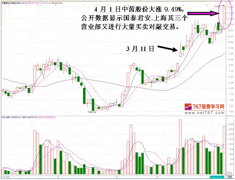 主力对敲的目的: 1. 利用对敲交易吸引投资者参与活跃个股交易气氛,有时属于主力为日K线制造一定的成交量以维持该股人气。2. 利用对敲制造交投活跃气氛,吸引跟风盘涌入以达到利用非该主力之外的资金入市共同推高股价以节省拉升成本。3. 利用对敲推高股价,为日后出货腾出空间或吸引跟风入场接货主力减仓派发。4. 利用对敲交易做盘制造大量不明交易以迷惑欺骗投资者让其看不清主力机构的真正操作意图。主力对敲的多种目的中,往往第三条对投资者是最具有意义的。认识熟悉主力利用对敲推高股价减仓出货行为,一是可以回避买入这类股票带来不必要的损失;二是手上如果持有这类股票,在出现明显的主力对敲诱多行为时可以及时退出。下面以近日主力利用对敲引跟风入场接货的经典个案天津松江[600225]为例剖析主力近年来减仓常用的出货手法。