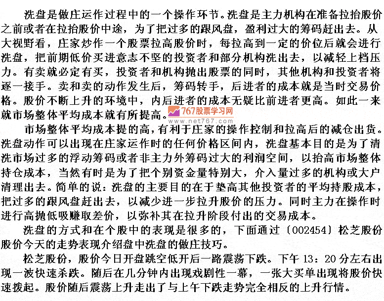 洗盘的方式是多种多样,最常见的洗盘方式是:“打压股价洗盘”。打压股价洗盘又可以分两大手法: 一.盘中直接砸低股价实施恐吓式洗盘二.盘中先快速拉高股价,然后慢慢往下打压实施威逼式洗盘 盘中直接砸低股价恐吓式洗盘, 砸低股价的时间是没有限制的,主力操盘手视乎他掌握的情况去实施。既有开盘就砸盘的,也有盘中砸盘的,尾盘14:30分后突然砸盘的也不少见。上市公司马上就要公布利好的个股,多以尾盘大幅砸盘居多。尾盘砸盘可以制造恐慌也能节省筹码。庄家利用尾盘砸盘洗盘,日K线上表现形态同样是下跌大阴线。其目的是在利好公布前把部分筹码清洗出去。尾盘砸盘洗盘当天,盘面上是很难看清楚砸盘行为是主力出货还是洗盘的。在放量下跌过程中往是卖单不断涌出。除了庄家心知肚明之外,外人难以测摸!现时相当多的庄家在展开洗盘时同时实施“高抛低吸”差价套利。如此一来洗盘盘口又是出货盘口,投资者利用技术分析去区分个股出现放量下跌走势属于庄家打压洗盘?还是在减仓出货?是相当难的!下面通过近日利好公布前ST 雄震600711的异常砸盘洗盘行为了剖析庄家尾盘砸盘洗盘过程。2010年12月23日(600711)"ST雄震"公布关于非公开发行股票申请获核准公告:“公司已收到证监督会批复文件 ,核准公司非公开发行6506.85万股新股。”对于一个连续两年经营亏损,急需资金,急需扭转亏损困局的ST雄震。证监会核准非公开发行新股募集资金改善经营无疑是利好。ST雄震在消息12月23日公布后股价已经连续两日涨停板。但事实上,利好消息公布之前12月22日,该股出现明显的打压洗盘痕迹。2月22日ST雄震股价14;45分后放量下跌直致将股价砸到跌停板价格收市。而第二日ST雄震利好消息“非公开发行股票申请获核准公布”股价立即连续涨停。利好出现之前一交易日,看是怪异的事并不怪异,这种尾盘股价异常就是事前知道内幕消息的庄家砸盘洗盘行为。