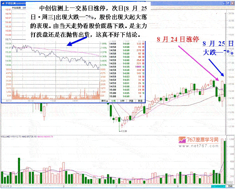 中创信测[8月24日·周二]涨停,收盘后公开交易数据显示卖出最多前五名,五大机构专用席位卖出金额近1亿元。占当天总成交金额1.76亿元的56%。由此分析明显昨天涨停机构在大量出逃,其它资金在介进。昨天机构大量抛售,今天股价低开低走出现大跌—7%,正是这个让看盘者难以判断,今天该股大跌到底是主力打洗盘还是在抛售出货。