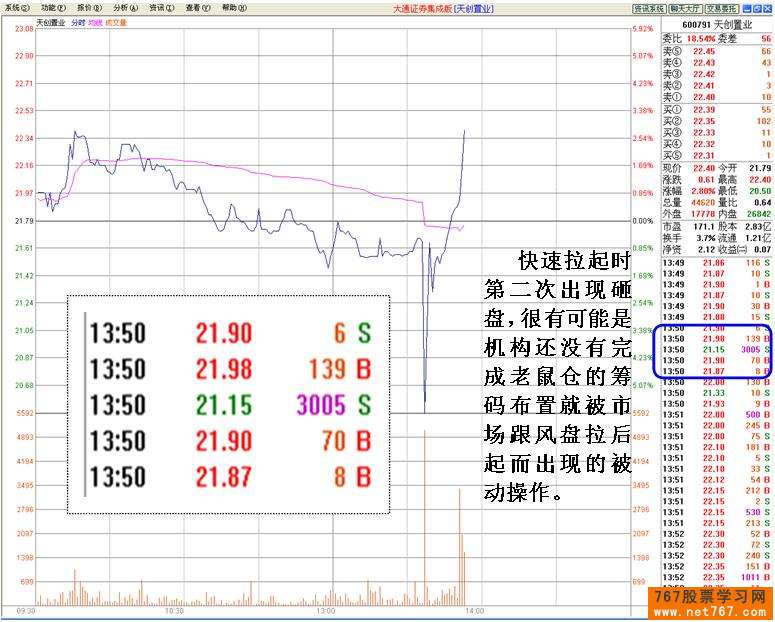 每个股票都有大量机构,大户持有。即使某个庄家控盘该股50%流通盘也不例外。作为一个股票的主庄,可以通过资金优势买卖去影响该股价格升跌。但他没有能力控制其他机构和大户的进出行为。一般机构和大户进出是根据各自对该股未来走势的判断而操作。主庄在实施操纵影响股价走势时,一般机构和大户也根据自己的判断选择持股,或买进,卖出。二者之间操作都是独立的,当二者共同出现在交易盘口中,发生反方向交易时,这就产生博弈行为。 主庄花钱出力拉升股价时,一般机构或大户趁机大量卖出,这无疑损害主庄的利益。当发生如此情况时,主庄一般也是相当无奈的。他们能做的要么是继续往上拉抬股价;要么通过打压股价来清洗盘。庄家积极花钱出力拉升股价时,或拉高股价后,场内其它机构和大户趁机抛出是常见之事。出现这样的盘面是观察二者实力和做空,做多态度的好时机。下面通过〔600528〕中铁二局 10月22日的动态盘口了介绍主庄与一般机构博弈行为。