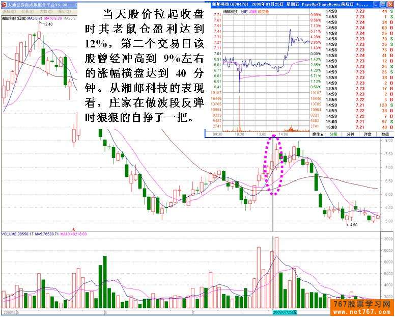 私募游资短线运作做庄分析地下私募运作资金的高成本和时间使用期限,这一因素很大程度上决定了它们必须在有限的时间里争取更多的操作主动权以获得收益。通俗的说高成本短期限的这类别资金大部分用到短周期做庄运作中去。这是地下私募活跃于股票市场的重要原因。短周期运作做庄模型已经成名的有多种。这几年来以光大证券宁波解放南营业部涨停敢死队的“追涨停”操作模型最为著名。当然这仅仅是私募运作的一种方式不是唯一方法。在笔者的长期跟踪研究中发现另一种较为成熟经典的短周期做庄运作模型。这种短周期运作做庄操作模型并不复杂,具体也就分为几个步骤:1. 选择价格在6---10元,股价波段充分调整后的个股作为的目标2. 先悄悄不动声色实施两到三个交易日建仓买入,明显特征多在尾盘边拉边买3. 经过两到三个交易日的悄悄建仓完成部分预定要收集的筹码后,次日下午于14:00点展开大动作尾盘大幅拉升股价,完成拉升盈利空间。4. 下一交易日即通过反复震荡出货,操盘手盘中通过对敲方式制造大量买盘吸引投资者跟风展开出货。后面两到三个交易日进行反复出货完成操作。此种短周期运作做庄操作模型按上述四大步骤展开。其特出特点其一是选择波段经过充分调整的低价股。这和涨停敢死队的“追涨停”操作完全不同。特点其二是先悄悄不动声色实施建仓,当建仓达到目的后不实施洗盘而出其不意马上拉升,技术上出现明显拉尾盘。最后拉尾盘涨幅在4%—6%之间,其操盘大胆而谨慎,不爱出风头。特点其三是,完成拉升后下一交易日的出货盘口中喜欢用这两年最流行的“卖盘压巨单,然后通过对敲分单分批连续买入”制造强大的买盘引诱投资者跟风出货。下面以近日私募运作的经典案例◇000099 中信海直为例介绍私募这一短周期运作做庄操作模型。私募选择的目标价格在6---10元之间,另外目标股票股价是在波段调整后,而不是去追涨。