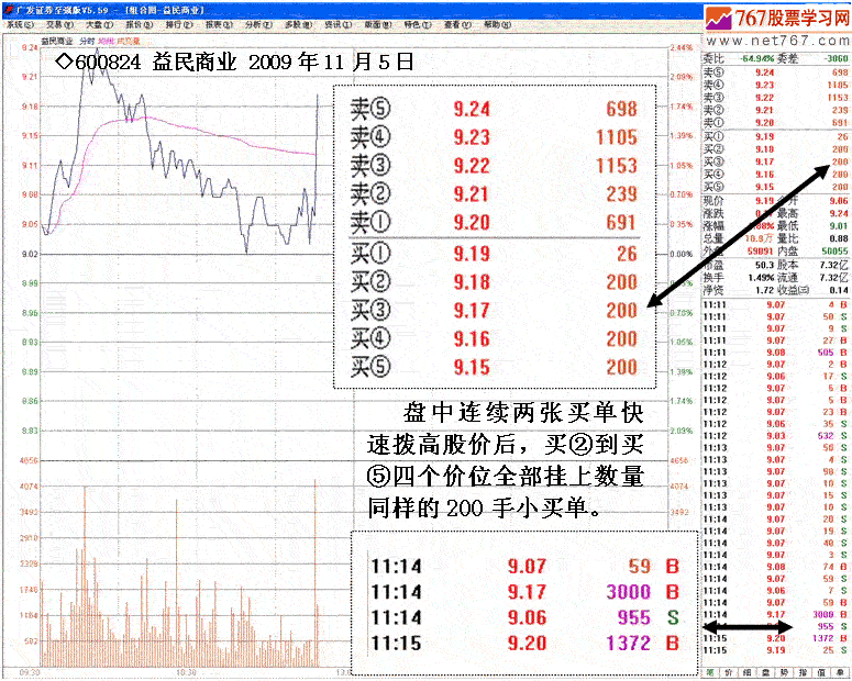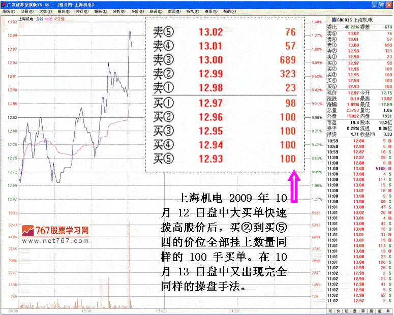 一般操盘手为了省事,在空缺价位挂出多张小买单时下单全部用如 100手,200手,数量相同的小单。为什么用数量相同的小单?就是为了下单输入时省事,这是多数操手做盘时的习惯。