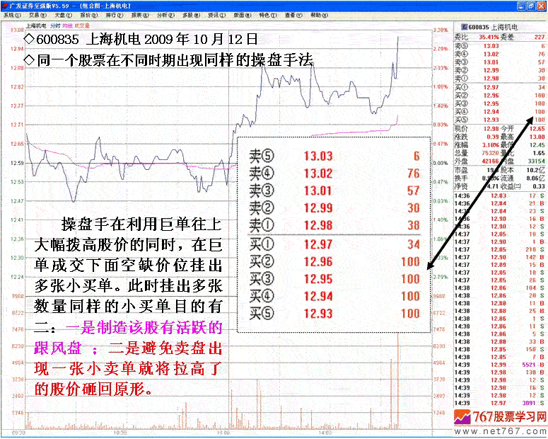 性格凶狠或者实力较强的庄家操盘手,有时利用一张数千甚至数万手的巨大买单将股价一笔就拨高数个百份点,这也是常见的拉高手法。此法拨高出现在平常交易不十分活跃的个股中时,大买单成交后买①和卖①之间挂单之间则存在较大的价格空缺。如果买①和卖①之间挂单之间的大量价位较长时间没有买卖单挂出,这是一种跟风不足的盘口。此时很容易出现一张小小的卖单就将,原本拉高了数个百份点的股价砸回原形。为了避免这一情况发生,操盘手在利用巨单往上大幅拨高股价的同时,在巨单成交下面的空缺价位挂出多张小买单。此时挂出多张小买单的目的有二:一是制造该股有活跃的跟风盘;二是避免卖盘出现一张小小卖单就将拉高了的股价砸回原形。