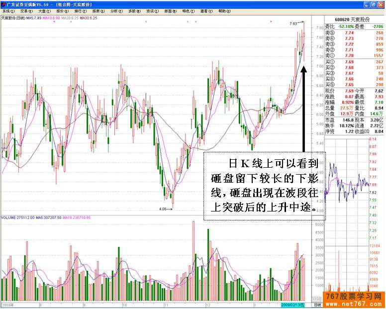 私募游资短线运作做庄分析地下私募运作资金的高成本和时间使用期限,这一因素很大程度上决定了它们必须在有限的时间里争取更多的操作主动权以获得收益。通俗的说高成本短期限的这类别资金大部分用到短周期做庄运作中去。这是地下私募活跃于股票市场的重要原因。短周期运作做庄模型已经成名的有多种。这几年来以光大证券宁波解放南营业部涨停敢死队的“追涨停”操作模型最为著名。当然这仅仅是私募运作的一种方式不是唯一方法。在笔者的长期跟踪研究中发现另一种较为成熟经典的短周期做庄运作模型。这种短周期运作做庄操作模型并不复杂,具体也就分为几个步骤:1. 选择价格在6---10元,股价波段充分调整后的个股作为的目标2. 先悄悄不动声色实施两到三个交易日建仓买入,明显特征多在尾盘边拉边买3. 经过两到三个交易日的悄悄建仓完成部分预定要收集的筹码后,次日下午于14:00点展开大动作尾盘大幅拉升股价,完成拉升盈利空间。4. 下一交易日即通过反复震荡出货,操盘手盘中通过对敲方式制造大量买盘吸引投资者跟风展开出货。后面两到三个交易日进行反复出货完成操作。此种短周期运作做庄操作模型按上述四大步骤展开。其特出特点其一是选择波段经过充分调整的低价股。这和涨停敢死队的“追涨停”操作完全不同。特点其二是先悄悄不动声色实施建仓,当建仓达到目的后不实施洗盘而出其不意马上拉升,技术上出现明显拉尾盘。最后拉尾盘涨幅在4%—6%之间,其操盘大胆而谨慎,不爱出风头。特点其三是,完成拉升后下一交易日的出货盘口中喜欢用这两年最流行的“卖盘压巨单,然后通过对敲分单分批连续买入”制造强大的买盘引诱投资者跟风出货。下面以近日私募运作的经典案例◇000099 中信海直为例介绍私募这一短周期运作做庄操作模型。私募选择的目标价格在6---10元之间,另外目标股票股价是在波段调整后,而不是去追涨。