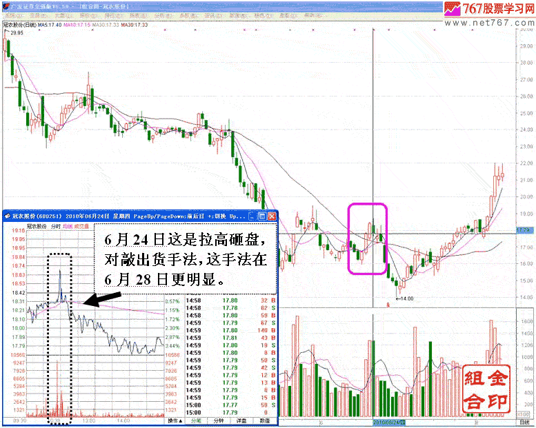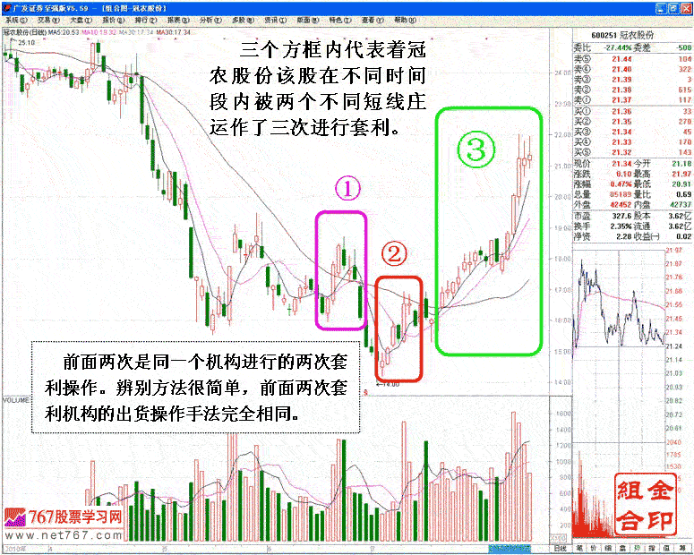 股市是个弱肉强食市场!证券交易电子化后投资者没有了面对面交易,交易过程中有法律的监督管理。所以证券市场已不存在强者舞刀弄斧强制威逼弱者买卖,也限制不了任何人的自由交易。没有了直接的欺行霸市之后,弱肉强食的过程换而然之的就是日日上演的欺诈蒙骗,引诱和陷阱!股票交易中的欺骗引诱和陷阱可以出现在大机构主力运作个股的任何阶段, 手法和方式多种多样。进场时庄家想尽办法让投资者交出手中的筹码;拉升前会把部分人先赶出去,出货时则千方百计引诱资金买入,为达目的不择手段。做庄也可通过制造散报虚假消息,通过操纵股价刻意制造图表欺骗广大投资者,这些都是家常便饭!现时大市正处于阶段性下跌之中,各大机构普遍忙于减仓出货。为达到顺利出货相,当多庄家在交易盘中巧妙布置各种各样的陷阱引诱投不明真相的投资者入场接盘。000938 紫光股份近日出现的,庄家通过操纵股价制造图表欺骗广大投资者跟风的操盘技巧甚为一绝。下面就以紫光股份庄家近日所展开的操盘行为介绍该庄家操盘手在交易盘中使用的经典诱多招数。先说说A股拆分上市概念之先例东北高速在重组过程中拆分为601188 龙江交通 和 601518 吉林高速两股,并于2010年3月19日在上海证券交易所正式上市交易。此例成为国内A股市场第一个由一家上市公司拆分为两家上市公司后再恢复上市之先例。拆分概念因此例横空出世!A股历来就有逢新必炒的习惯!龙江交通和吉林高速拆分后3月19日上市交易,稍后即出现二股双双被机构连拉出三个涨停走势。二股的暴涨使得拆分概念席此深入人心! 4月中旬以同方股份,紫光股份为首拆分概念股异军突起,其中紫光股份连拉两个涨停引爆拆分概念股全线一夜之间飘红。而实际上从拆分概念股的后面表现可以看到,相当部分主力利用该概念连续拉上升两到三日后立即转手出货。紫光股份的表现更甚是明显。下面通过紫光股份近日的股价表现剖析其主力运作该股拉高出货的操作思路。以及庄家操盘手通过巧妙布置陷阱引诱投资者入场接盘的操纵行为。