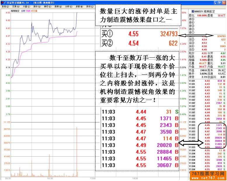 个股坐庄操盘看是有钱有消息有渠道就行,真正运作起来需要庄家操盘手有相当丰富的操盘运作经验。一个经验丰富的操盘手日常操盘能做到恰如其份,面对市场能做到灵活应变!进货时能在适当价格拿到想要的筹码;拉升时能利用最少的资金达到拉升的目的;出货时能调动市场其他投资者入场接盘。而一个没有多少实践经验的操盘手操作起来往往出现生般硬套操作路套。 拉升阶段,只要有足够的资金,不断买入就能拉高股价。但实际上没有那一家机构的钱会多到没有预算的。资金分配上吸筹作为仓底货用去大部分。用作拉高股价和后备护盘等需要的各占部分。确定目标介入时,坐庄资金吸筹,拉升,后备各部分所占比例都是有计划和预算的。因此用作拉高的资金自然是有限的。入庄吸筹完毕后展开拉升,拉升时需要买入消化部分卖盘才能将股价拉起。股价越拉越高,越往上买筹码成本就越高。拉升阶段买入量越大对庄家所持筹平均成本提高影响就越大。因此,拉升阶段庄家操盘手能以最少的买入量达到拉高股价那最符合坐庄利益。 除了拉高需要投资资金,交易盘中股价拉高后同样也有抛盘不断抛出。盘中股价拉高后要将股价维护在一定的涨幅还要护盘。就交易盘口而言,操盘手拉高股价后需要在高位接下部分抛筹才能将股价维持一定的涨幅。拉升需要钱,拉高后护盘也是需要钱。没有一定的操作水准这些环节不容易做好。 拉升的目的就是为了拉高股价!交易中拉高股价操作手法则很多。常见的有直线拉高;震荡上行,波浪式拉高,阶段式拉高- - -等等。每种拉升方法都有它的优缺点。庄家操作手根据自己实力强弱,所操作个股控盘度高低,个股流通盘大小的差异,股性活跃程度等采用适当的拉高方法。 所谓“直线拉高”,也就是一口气拉高数个百份点。这是一种较为凶狠的拉升手法。此拉升手法优点是快速拉高,不让跟风盘在低位有更多的进货时间。直线拉高省时但由于股价在极短时间内拨高,没有足够的时间消化中途卖盘,用此种手法拉高后盘中股价往往面临十分强大的抛压。 性格凶狠或者实力较强的庄家操盘手,有时利用一张数千甚至数万手的巨大买单将股价一笔就拨高数个百份点,这也是常见的拉高手法。此法拨高出现在平常交易不十分活跃的个股中时,大买单成交后买①和卖①之间挂单之间则存在较大的价格空缺。如果买①和卖①之间挂单之间的大量价位较长时间没有买卖单挂出,这是一种跟风不足的盘口。此时很容易出现一张小小的卖单就将,原本拉高了数个百份点的股价砸回原形。为了避免这一情况发生,操盘手在利用巨单往上大幅拨高股价的同时,在巨单成交下面的空缺价位挂出多张小买单。此时挂出多张小买单的目的有二:一是制造该股有活跃的跟风盘;二是避免卖盘出现一张小小卖单就将拉高了的股价砸回原形。 一般操盘手为了省事,在空缺价位挂出多张小买单时下单全部用如 100手,200手,数量相同的小单。为什么用数量相同的小单?就是为了下单输入时省事,这是多数操手做盘时的习惯。