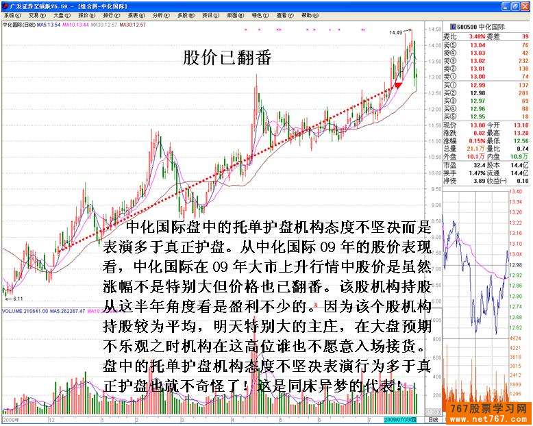 个股坐庄操盘看是有钱有消息有渠道就行,真正运作起来需要庄家操盘手有相当丰富的操盘运作经验。一个经验丰富的操盘手日常操盘能做到恰如其份,面对市场能做到灵活应变!进货时能在适当价格拿到想要的筹码;拉升时能利用最少的资金达到拉升的目的;出货时能调动市场其他投资者入场接盘。而一个没有多少实践经验的操盘手操作起来往往出现生般硬套操作路套。 拉升阶段,只要有足够的资金,不断买入就能拉高股价。但实际上没有那一家机构的钱会多到没有预算的。资金分配上吸筹作为仓底货用去大部分。用作拉高股价和后备护盘等需要的各占部分。确定目标介入时,坐庄资金吸筹,拉升,后备各部分所占比例都是有计划和预算的。因此用作拉高的资金自然是有限的。入庄吸筹完毕后展开拉升,拉升时需要买入消化部分卖盘才能将股价拉起。股价越拉越高,越往上买筹码成本就越高。拉升阶段买入量越大对庄家所持筹平均成本提高影响就越大。因此,拉升阶段庄家操盘手能以最少的买入量达到拉高股价那最符合坐庄利益。 除了拉高需要投资资金,交易盘中股价拉高后同样也有抛盘不断抛出。盘中股价拉高后要将股价维护在一定的涨幅还要护盘。就交易盘口而言,操盘手拉高股价后需要在高位接下部分抛筹才能将股价维持一定的涨幅。拉升需要钱,拉高后护盘也是需要钱。没有一定的操作水准这些环节不容易做好。 拉升的目的就是为了拉高股价!交易中拉高股价操作手法则很多。常见的有直线拉高;震荡上行,波浪式拉高,阶段式拉高- - -等等。每种拉升方法都有它的优缺点。庄家操作手根据自己实力强弱,所操作个股控盘度高低,个股流通盘大小的差异,股性活跃程度等采用适当的拉高方法。 所谓“直线拉高”,也就是一口气拉高数个百份点。这是一种较为凶狠的拉升手法。此拉升手法优点是快速拉高,不让跟风盘在低位有更多的进货时间。直线拉高省时但由于股价在极短时间内拨高,没有足够的时间消化中途卖盘,用此种手法拉高后盘中股价往往面临十分强大的抛压。 性格凶狠或者实力较强的庄家操盘手,有时利用一张数千甚至数万手的巨大买单将股价一笔就拨高数个百份点,这也是常见的拉高手法。此法拨高出现在平常交易不十分活跃的个股中时,大买单成交后买①和卖①之间挂单之间则存在较大的价格空缺。如果买①和卖①之间挂单之间的大量价位较长时间没有买卖单挂出,这是一种跟风不足的盘口。此时很容易出现一张小小的卖单就将,原本拉高了数个百份点的股价砸回原形。为了避免这一情况发生,操盘手在利用巨单往上大幅拨高股价的同时,在巨单成交下面的空缺价位挂出多张小买单。此时挂出多张小买单的目的有二:一是制造该股有活跃的跟风盘;二是避免卖盘出现一张小小卖单就将拉高了的股价砸回原形。 一般操盘手为了省事,在空缺价位挂出多张小买单时下单全部用如 100手,200手,数量相同的小单。为什么用数量相同的小单?就是为了下单输入时省事,这是多数操手做盘时的习惯。