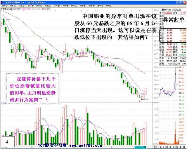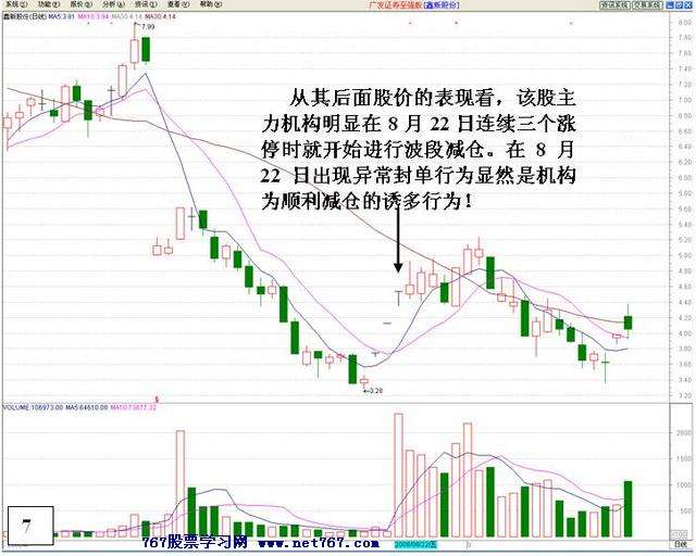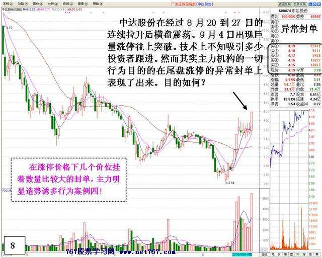 所谓尾盘逆市拉升,通俗的说就是股市在临近收市时段,股指出现较大幅度的调整而个股出现与大盘方向相反的大幅拉升。个股出现这种尾盘逆市拉升行为一般为主力机构操纵行为。其操作目的是分为多种。一. 尾盘逆市拉升属机构收集筹码。在大市和个股都处于低位时部分主力机构入场吸筹会用尾盘逆市拉升这一招去收集筹码。在大盘当天调整特别是尾市出现跳水时,持股投资者一般表现出较为恐慌情绪,此时最容易产生获利了结或者止损离场观望情绪。主力在尾市逆市拉高股价,给产生获利了结或止损离场者一个高价退出的机会这样很容易收集到筹码。这一收集筹码招数往往会在主力入庄整个收集筹码过程中断续出现多次。尾盘逆市拉升属机构收集筹码个股尾盘拉升幅度一般情况下不会超过5%涨幅。因为此时的机构不希望暴露自己入庄的行踪。当然在遇到上市公司马上就要公布利好消息等已不候主力慢慢收集筹码的情况,主力有时会进行一口气拉出巨大涨幅甚至涨停通吃的方式收集筹码。笔者曾经操作过的案例(600546)中油化建在08年11月5日和7日的尾盘暴拉就是如此。 二 . 尾盘逆市拉升属机构主力表现实力。 这是标准的“出风头”行为! 机构是什么?通俗的说机构是一个团队。团队中成员工作各有各自的分工,在做庄行为上真正起决策作用的只有一两个人。行内把起决策作用的主脑称为操盘手。(负责买卖下单的小妹只能称为下单员,不是真正意义上的操作盘手。)操盘手是一个人,市场中存在各种各样的操盘手,其性格和操盘风格各不同样。小部分操盘手喜欢在操作时做出各种各样夸张的盘口出风头并不奇怪。 尾盘逆市拉升这种爱出风头有时是主力显示自我实力的表现。部分主力机构在大盘大跌当天尾盘逆市拉升股价则属护盘行为,在护盘时表现的异常突出,超强势的尾盘逆市拉升其他目的是想告诉目标股票持有者,该股主力很有实力很强大。09年2月18日大盘大跌当天尾盘逆市拉起600712 南宁百货有此味道!三. 尾盘逆市拉升属机构吸引投资者目光,引诱跟风盘跟进以便减仓行为。这是游资,短庄,实力一般主力较常做的事情。在大盘当天大跌或者尾盘大跳水时,某个股票出现逆市强势拉升的确是很耀眼的。道理很简单,大盘当天大跌或者尾盘大跳水时,个股票出现逆市上涨表现超强的拉高往往会在5分钟涨速榜中出现并停留较长时间。现在的投资者看盘免不了看深圳市场或上海市场中83 和81 综合排名榜。喜欢短线操作者更是不断盯梢行情软件中83 和81涨速榜。对于尾盘逆市暴拉的个股总能吸引更多投资者的目光,也能有效的吸引一些短线跟风盘跟进,主力利用这招减仓派发较为常见。主力机构如此操作不仅仅是在逆市拉升当天减仓更是为后面短期内的减仓埋下伏笔。 下面来看看市场中的实践个案。 [NextPage]