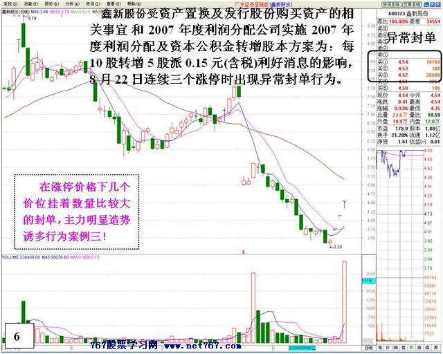 日常看盘在技术分析中,个股交易盘口中出现巨大的买单扫货是大资金入场的特征。实战分析可并没有这么简单。巨单扫货在不同个股不同时间段,价格所处不同位置,不同市场环境中出现其意义可以是千差万别甚至相反的。数量上从数千到数万手一张的大买单出现在某个股票交易盘口中包含多种意义:真正大资金在吸货,机构表现实力,机构诱多出货,机构对敲交易 ------ 通俗意义下的巨单扫货原意多为代表大资金入场的象征,实际上则具多样性。技术分析难,难在同一组数据,在不同的个体,不同位置,不同环境下出现具有多样性和不确定性,而这些都还没有多少真正有效可参照研的判断思路和技巧可参考,权威理论就更谈不上了!下面个股经典案例介绍“巨单扫货”在个股波段高位出现属于诱多骗局主力操纵行为作剖析。在理论上为此环境下出现的此类个股分析判断思路作一定的技术分析指引。