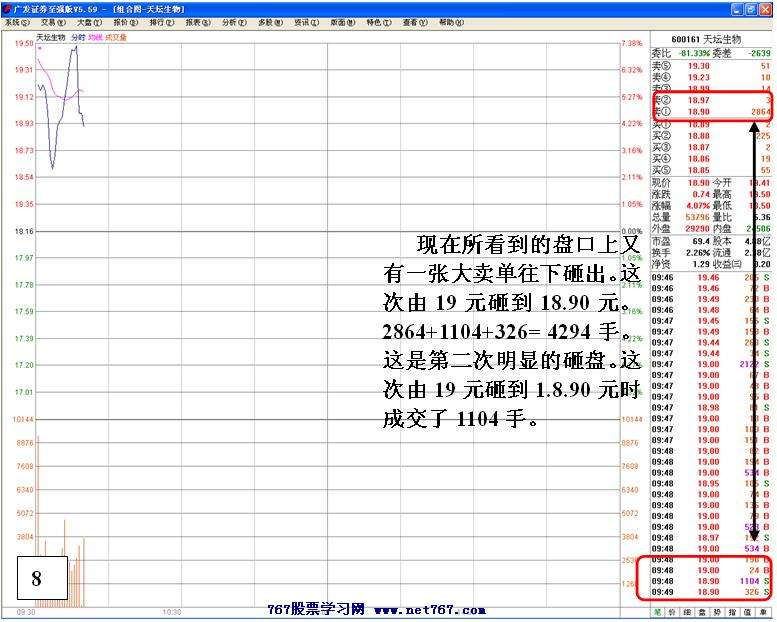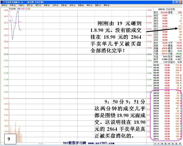 个股的洗盘手法甚多,具体到个股中不同个有各的形态差别。在分类上市场存在的机构操纵个股的洗盘行为可以分为三大类: 一. 制造或者利用利空消息洗盘。二 .通过股价格的长期横盘,拉升,打压洗盘。三 .利用卖盘挂单数量变化恐吓洗盘。下面根据今日盘口中笔者观察所发现的主力机构利用卖盘巨大挂单恐吓洗盘个案600741 华域汽车介绍介绍利用卖盘挂单数量变化恐吓洗盘盘口知识。 利用卖盘巨大挂单恐吓洗盘的简单原理就是已潜伏在目标个股中的主力机构利用已经持有的流通筹码集中在一个价位或多个价位挂出数量特别巨大的卖单。巨大的卖单在交易盘口上出现所制造的是一种股价盘中上升或下跌遇到巨大抛压。这样的盘口往往能在投资者心理上形成较大的压力使用一些不明真相的投资者选择获利了结或退出观望。一般主力机构利用这个方法进行恐吓洗盘时,卖盘巨大的卖单当天会在盘口中反复出现,有时多天连续出现。(600741)华域汽车今日的盘面就出现上述情况。下午14:23分该股在9.40元出现一张数量达到10万手的巨大卖单。大卖单一直压着华域汽车股价横向震荡,在强势市场中出现这样的盘口令该股上升无望无疑给该股持有者产生较大的压力。这种市情下会有不少投资者选择退出去追买其他强势股操作。些没有忍耐力不稳定的筹码自然会选择撤退。华域汽车大卖单压单近半小时后最后在14:54分开始出现买盘连续往9.4元10万手巨大卖单啃去,最后完全消化10万手卖单后股价出现快速拉高。主力机构拉升之前的压单洗盘行为明显,该股后市有望再上一台阶!