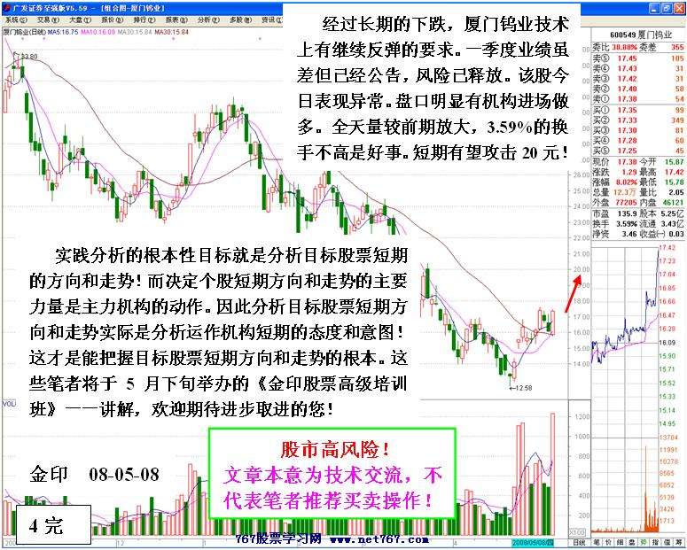 所谓尾盘逆市拉升,通俗的说就是股市在临近收市时段,股指出现较大幅度的调整而个股出现与大盘方向相反的大幅拉升。个股出现这种尾盘逆市拉升行为一般为主力机构操纵行为。其操作目的是分为多种。一. 尾盘逆市拉升属机构收集筹码。在大市和个股都处于低位时部分主力机构入场吸筹会用尾盘逆市拉升这一招去收集筹码。在大盘当天调整特别是尾市出现跳水时,持股投资者一般表现出较为恐慌情绪,此时最容易产生获利了结或者止损离场观望情绪。主力在尾市逆市拉高股价,给产生获利了结或止损离场者一个高价退出的机会这样很容易收集到筹码。这一收集筹码招数往往会在主力入庄整个收集筹码过程中断续出现多次。尾盘逆市拉升属机构收集筹码个股尾盘拉升幅度一般情况下不会超过5%涨幅。因为此时的机构不希望暴露自己入庄的行踪。当然在遇到上市公司马上就要公布利好消息等已不候主力慢慢收集筹码的情况,主力有时会进行一口气拉出巨大涨幅甚至涨停通吃的方式收集筹码。笔者曾经操作过的案例(600546)中油化建在08年11月5日和7日的尾盘暴拉就是如此。 二 . 尾盘逆市拉升属机构主力表现实力。 这是标准的“出风头”行为! 机构是什么?通俗的说机构是一个团队。团队中成员工作各有各自的分工,在做庄行为上真正起决策作用的只有一两个人。行内把起决策作用的主脑称为操盘手。(负责买卖下单的小妹只能称为下单员,不是真正意义上的操作盘手。)操盘手是一个人,市场中存在各种各样的操盘手,其性格和操盘风格各不同样。小部分操盘手喜欢在操作时做出各种各样夸张的盘口出风头并不奇怪。 尾盘逆市拉升这种爱出风头有时是主力显示自我实力的表现。部分主力机构在大盘大跌当天尾盘逆市拉升股价则属护盘行为,在护盘时表现的异常突出,超强势的尾盘逆市拉升其他目的是想告诉目标股票持有者,该股主力很有实力很强大。09年2月18日大盘大跌当天尾盘逆市拉起600712 南宁百货有此味道!三. 尾盘逆市拉升属机构吸引投资者目光,引诱跟风盘跟进以便减仓行为。这是游资,短庄,实力一般主力较常做的事情。在大盘当天大跌或者尾盘大跳水时,某个股票出现逆市强势拉升的确是很耀眼的。道理很简单,大盘当天大跌或者尾盘大跳水时,个股票出现逆市上涨表现超强的拉高往往会在5分钟涨速榜中出现并停留较长时间。现在的投资者看盘免不了看深圳市场或上海市场中83 和81 综合排名榜。喜欢短线操作者更是不断盯梢行情软件中83 和81涨速榜。对于尾盘逆市暴拉的个股总能吸引更多投资者的目光,也能有效的吸引一些短线跟风盘跟进,主力利用这招减仓派发较为常见。主力机构如此操作不仅仅是在逆市拉升当天减仓更是为后面短期内的减仓埋下伏笔。 下面来看看市场中的实践个案。 [NextPage]