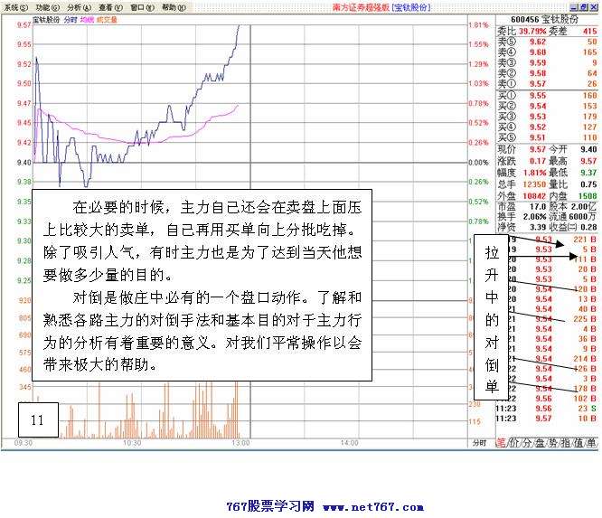 捕捉到短线飙升的个股的投资者向往的事情!捕捉短线飙升的个股的方法是多种多样的,有人用指标去判断捕捉;有人均线去判断捕捉;有人形态去判断捕捉;有人量能去判断捕捉;也有人利用软件交易席位去判断捕捉。如邓老所讲:不管猫白黑猫,抓到老鼠就是好猫! 不管什么方法,捕捉短线飙升的个股就是好方法! 笔者用的是主力行为学捕捉短线飙升的个股。简单的说就是跟踪观察研究个股中的主力机构。当主力机构表现出强的拉升欲望和行动时就及时跟进。 笔者认为,利用主力行为学捕捉短线飙升的个股是目前跟庄的最有效方法。当然也是最难的方法。部分个股主力机构在决定拉升之前都会出来做好事前的准备工作。这些工作内容有时会在目标股票的盘口上,分时走势上,成交量能上表现出 “异常” 的交易状态。这种“异常” 的交易状况是我们跟踪研究和判断主力机构后面行为动作目的的关键。至于这种“异常”没有统一的标准,大都靠多年累积的经验判断。 下面以实践案例介绍主力机构决定拉升之前,操盘手活动时在个股盘口上,分时走势上,成交量上“异常” 的表现!780) this.width=780" border=0>