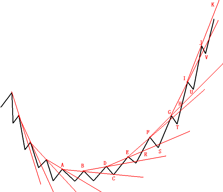 2.突破内径线就会加速涨。如图中FG点直线,被H点突破后,引起暴涨。想在暴涨前买入吗?找内径线突破的一瞬间。