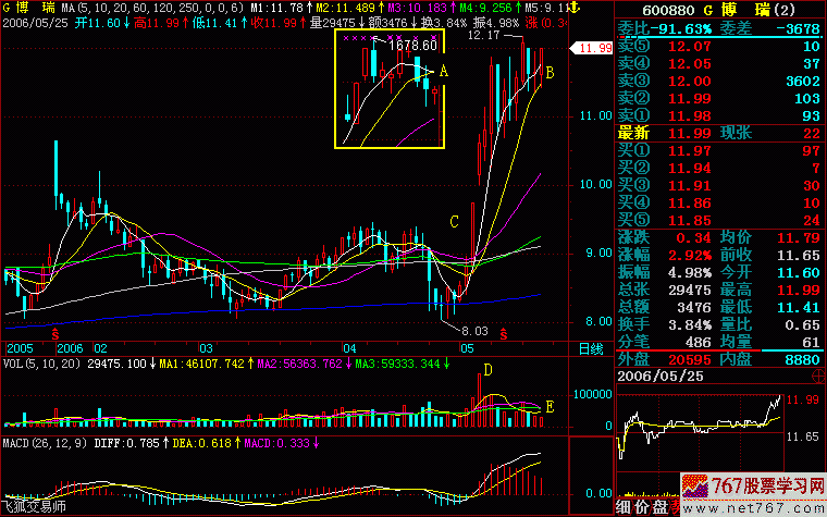 怎样寻找“强于大盘”的个股呢?(图270-1)中A点是上证指数5日平均线和10日平均线死亡交叉,这是大盘走弱的表现。此时,所有5日平均线和10日平均线死亡交叉的个股都是弱势股,而所有5日平均线和10日平均线没有死亡交叉的个股都是强势股,其中必有大黑马,就这么简单。当然,强势股与“沙盘”技术相结合,选股的效果更好。如600880G博瑞是沙盘中位置较高的个股,B点可见它的5日平均线和10日平均线没有死亡交叉,或称它“通气”股,它身兼“沙盘”和“通气”两个技术特点,既能量强又强于大盘,兼顾了形态和能量两方面,这样选出的黑马,成功率就大大地提高了。图中D至E是“量越盘越小,价越盘越高”,是典型的大黑马形态。