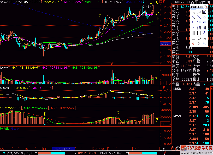 第274节:飞碟图274-1股改后上市第一天,不少个股巨量跳空高开,形成“股改缺口”。(图274-1)000768G西飞高开在B点处,以后是冲高A点,再跌
