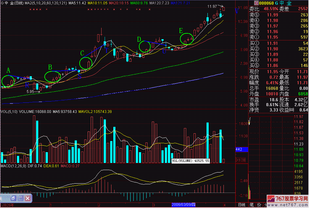 第260节:二次零上红金叉图260-1(图260-1) C点处,出现MACD金叉,但是零轴线之下的金叉。按照广通技术讲,零下金叉都是弱市中的反弹买进点,买
