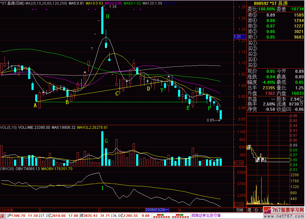 1.OBV上识别出货。G点三根大阴线,是出货,还是进货?看I点的OBV就一目了然。如进货,OBV应该金叉,如出货,就是死叉,I点是明显的死叉,