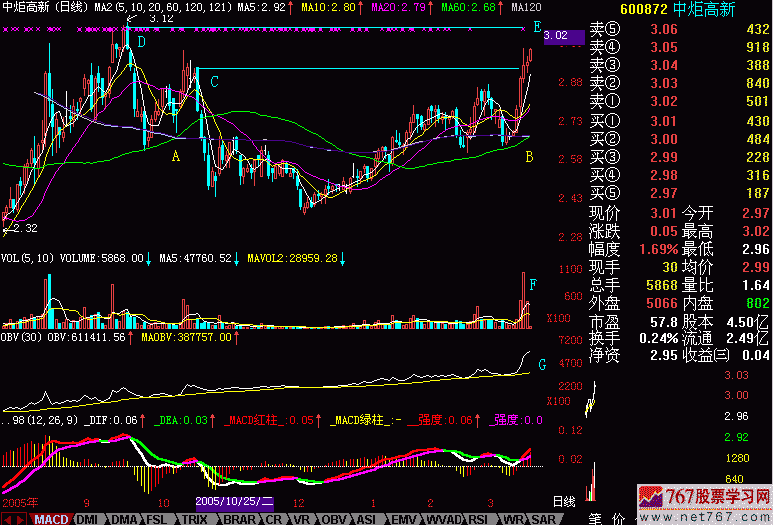 以前我们学过股价走势的飞行理论,是指日K线走势沿着60日平均线滑行,拉起机头,股价就上涨了。今天我讲OBV飞行理论,大家看(图241-1)中G点处的OBV平均线,相对比较平坦,像机场的跑道,OBV线稍有起伏,沿着30平均线滑行。请大家注意,OBV线是向上倾斜的,有拉起机头的迹象。