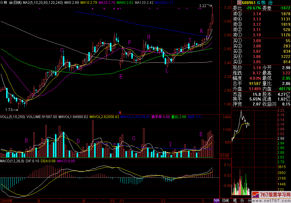 2.在年线下,庄家对自己操盘的股价要求是“隐蔽性”好,这样既利于自已更多地建仓,又能麻痹对手不来跟风沾光。为了加强建仓,股价就会上涨;为了隐蔽性,就要减速建仓。这是一对矛盾,解决这个矛盾的方法是震仓洗盘。当涨速过快时,突然用阴线杀跌。这一方面减缓了上升速度,破坏了图形,吓退了跟风盘;另一方面也有高抛低吸的差价可赚,降低了建仓的成本。图中,B到C是建仓,成交量明显放大,股价上升。C到D是震仓洗盘,成交量快速萎缩。D到E至F,又一次建仓。F至G是洗盘。注意,这次洗盘的成交量进一步萎缩,说明在散户手里的浮动筹码并不多。G至H又一次建仓,且有一日放巨量。H至L是长达十天的杀跌,阴线逐日拉长,切断五条平均线,佯装成“断头铡刀”,头部初显。一些原本还坚定持股的散户终于失去持股信心,落荒而逃。在L点,已进入2-3区间。I点处出现两日微小成交量,称为“量芝麻点”,说明洗盘已经洗干净了,该逃的浮动筹码也该逃了,不逃的狡猾份子也不会逃了。此时,庄家的建仓洗盘任务完成了,下一步是如何冲过年线。