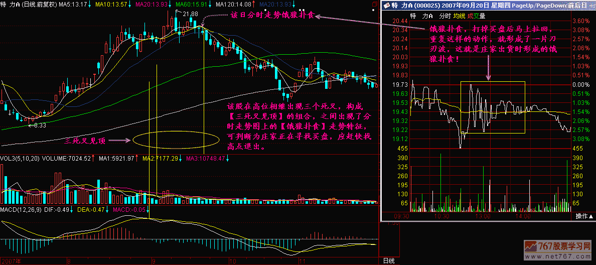 (1)当庄家把股价推高到一定高度后,就进入到派发阶段,在月均线系统上可能出现死亡交叉或价压,这时最容易出现饿狼扑食的图形。
