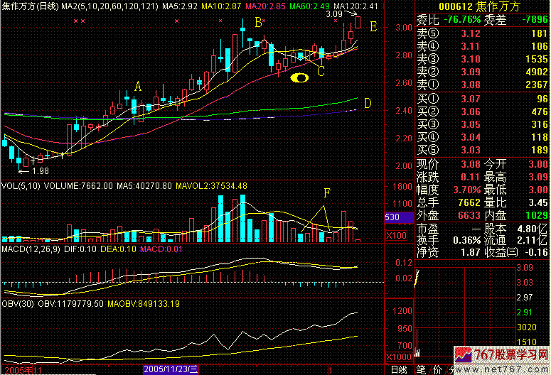 4.鸭嘴在D处,由60日平均线和120日平均线组成了鸭嘴,要求两线之间的距离要大。两线之间的距离大,说明鸭嘴大,叫起来才响亮。