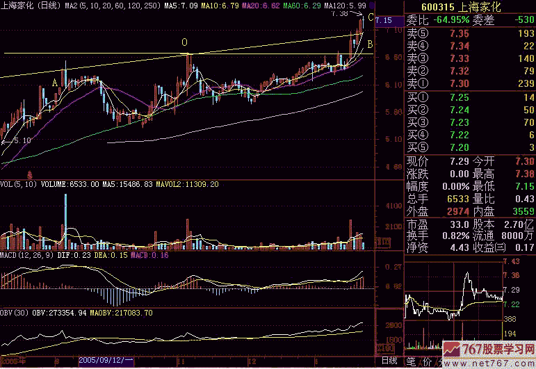 这样的上升通道有什么好处呢?首先是方便。得来全不费力气,省得画下轨了。第二是稳定。它比“由上升走势的两个低点”画出的下轨更稳定可靠。因为两个低点可操纵,而120日平均线很难操纵。第三是直观。股价先突破BO线,有被“挤压”得无路可走,只得向上突破的感觉。然后突破CO线,向上突破的态势十分明确。