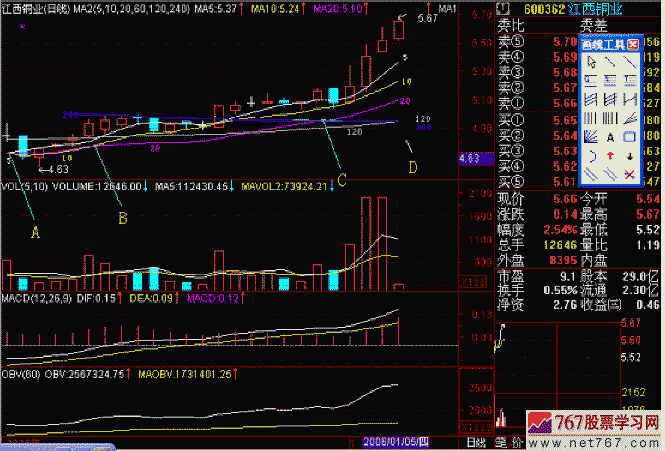 4.图中,还有“东方红大阳升”、“MACD零上红”、“OBV向上开口”等做多技术特征,这些都支持我们看好江西铜业的后市。