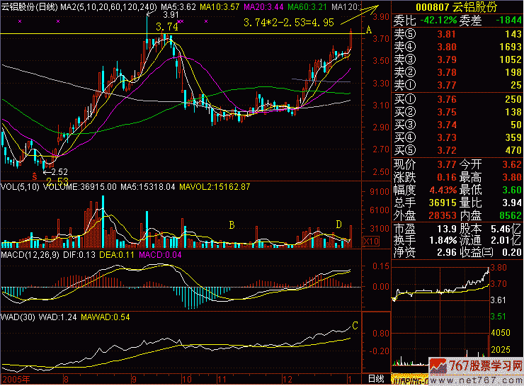 (1)在图中3.74元的收盘价高点作水平线A,就得到颈线。今日K线跳起来,够得着颈线,这时如果放量,就有可能冲过颈线,开拓颈线上方的空间。如果今日K线比A线低得多,如一个涨停板也够不着颈线,那就没戏。假如跳一跳,够不着,又不放量,那就更没戏了。运气好时,还能慢慢涨,运气不好时,没完没了地跌,总之,不会发动大行情的。一个快速盈利的短线高手,眼球只盯着跳一跳够得着的个股。